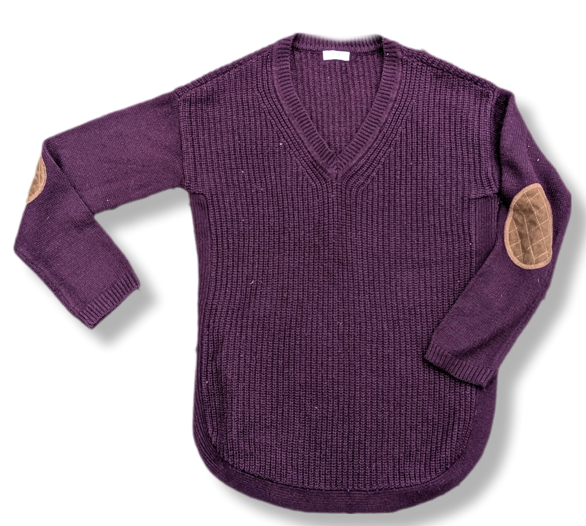 Chandail en tricot prune à col en V & patchs aux coudes | ARDÈNE | SMALL