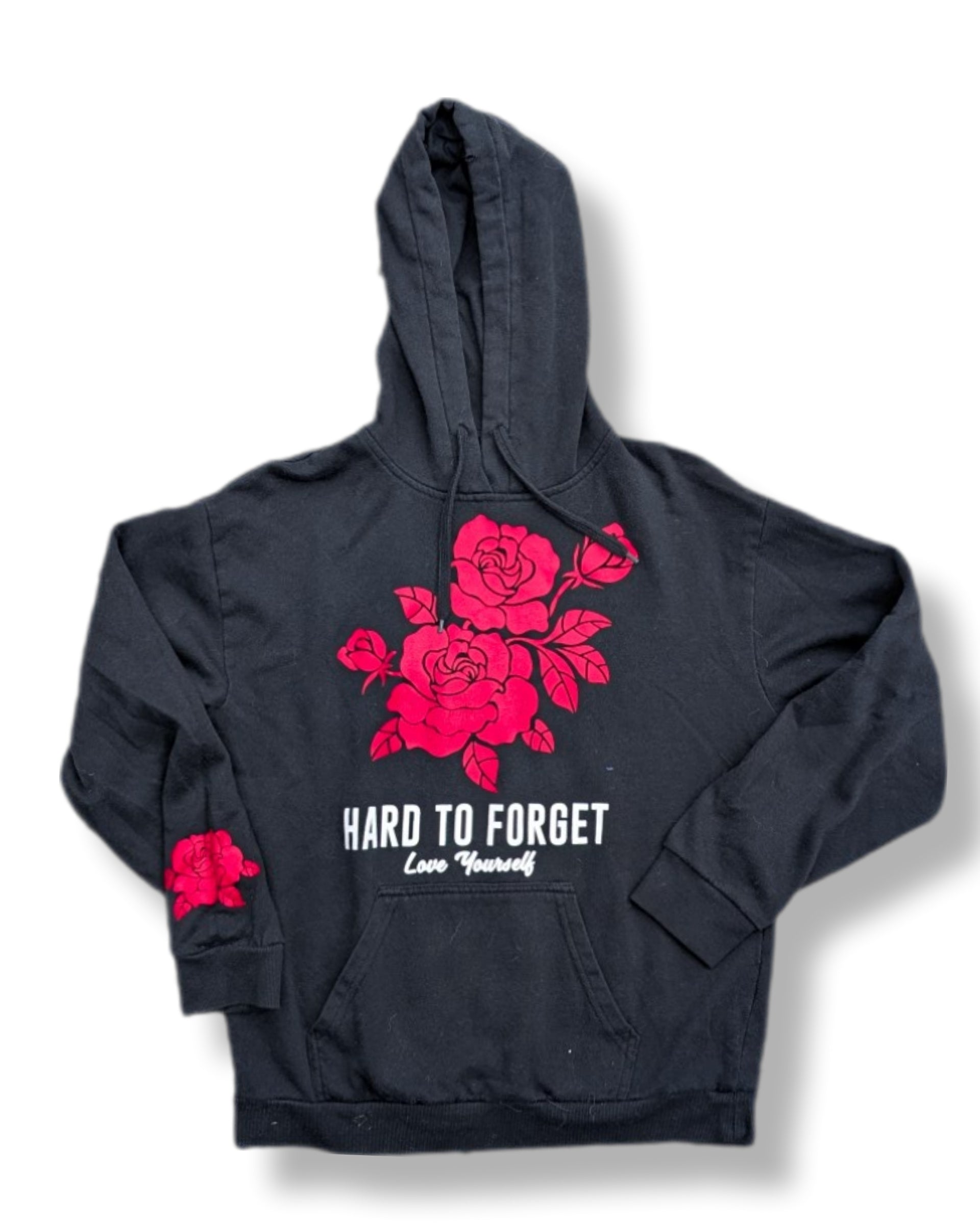 Chandail noir à capuchon avec roses imprimé devant & derrière | Amnesia | MÉDIUM