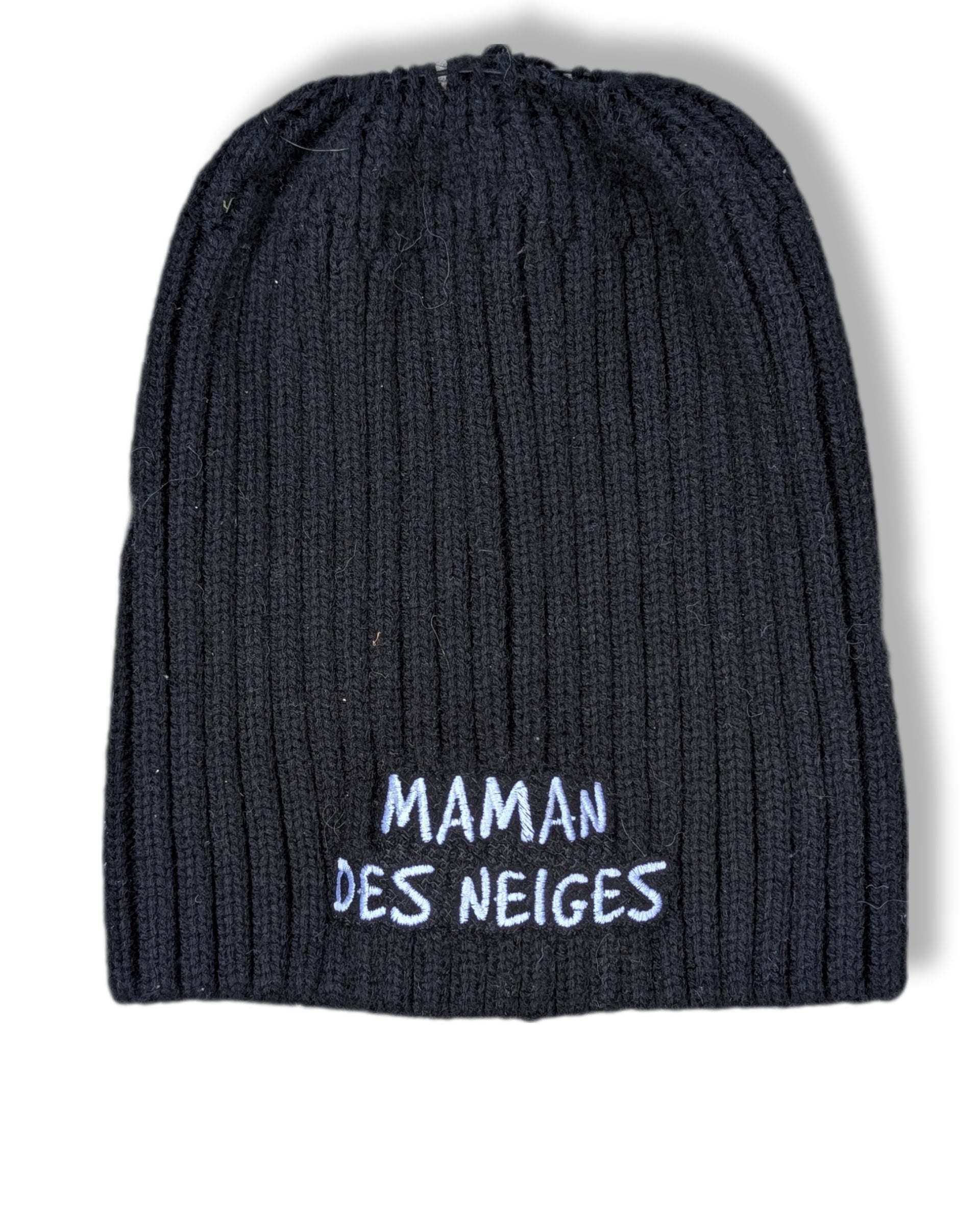 Tuque en tricot côtelé noir avec inscription "Maman des neiges" & trous pour sortir une couette de cheveux | T/U