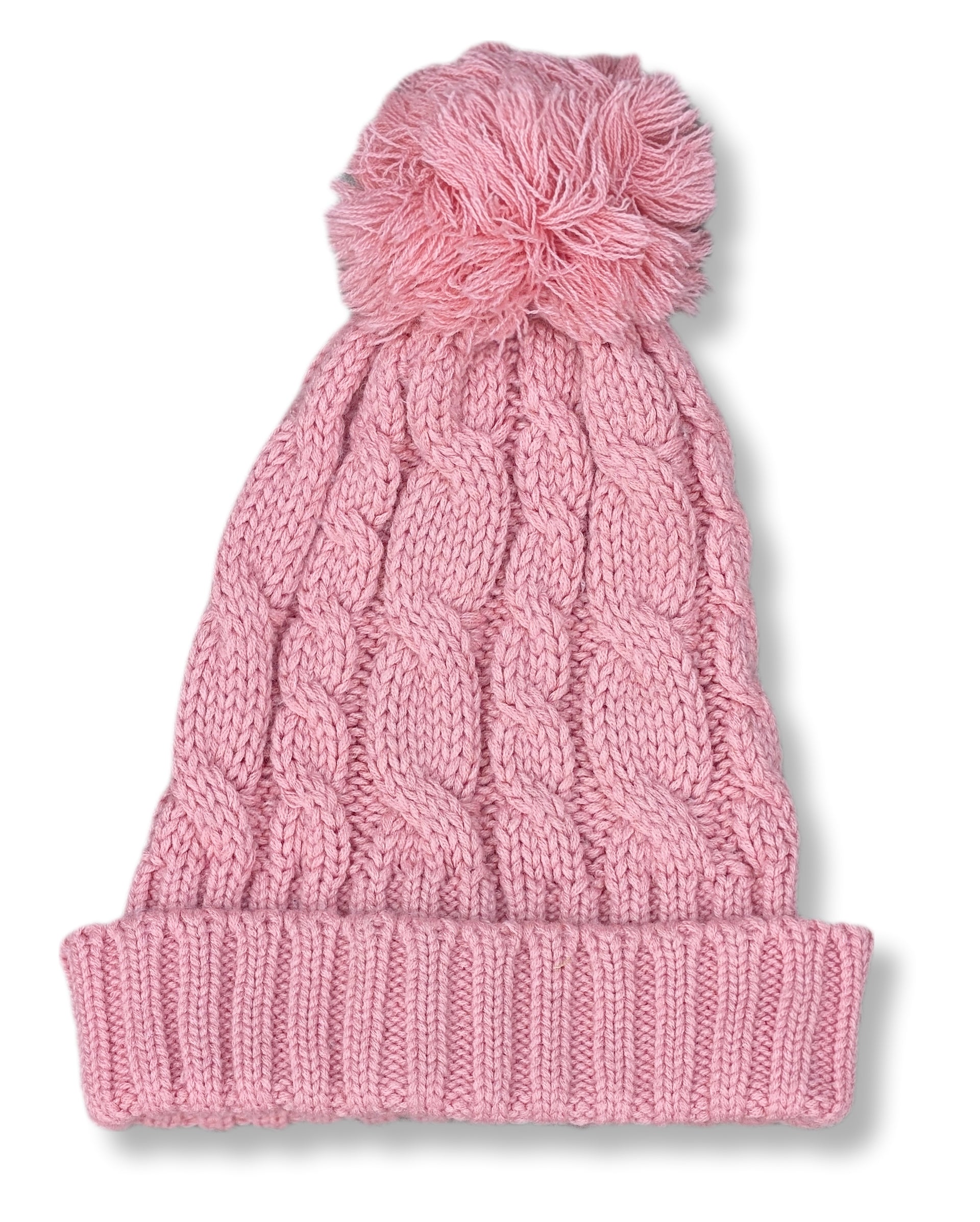 Tuque en tricot côtelé rose pâle avec gros pompon | T/U