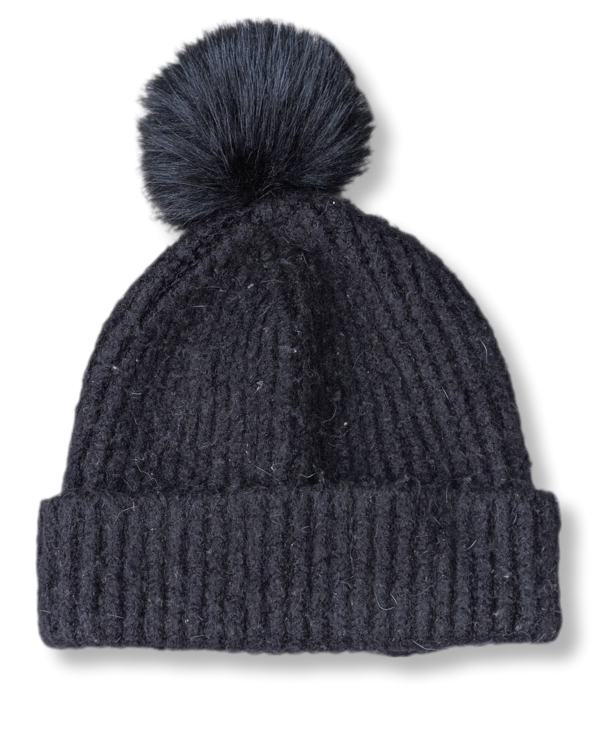 Tuque en tricot noir côtelé avec pompon en fausse fourrure | Kstudio | T/U